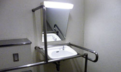 | ピクトグラム等の表示が分かりにくく、トイレの位置が分かりづらい点もあります。しかし、点字ブロックがトイレ内まで続いていたり、車椅子用トイレの広さが十分に有り、手すりが開閉できるようになってるなど、UDに配慮した設計になっています。水を流す際は、紐を引っ張るだけで流れるという簡単な仕組みになっています。電気をつけるボタンは大きな押しボタンとなっており、押しやすくなっています。 |
